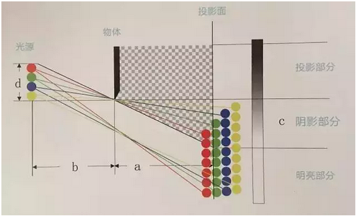 影子虚实度是可以度量和控制的如下图所示,左边表示光源,右边表示投影面,中间有一块遮光板这样在投影面的上下会产生投影部分和明亮部分我们知道光线是直线传播的如果有一根日光灯长度为d,分为红绿蓝黄表示光源的集合他们依次排列在投影面上面,在投影部分和明亮部分之间会形成明暗渐变过渡部分,这里称c阴影部分。