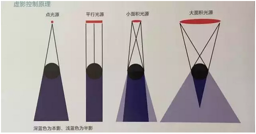 2.一定面积光源,遮挡距离a越大,阴影部分c越大